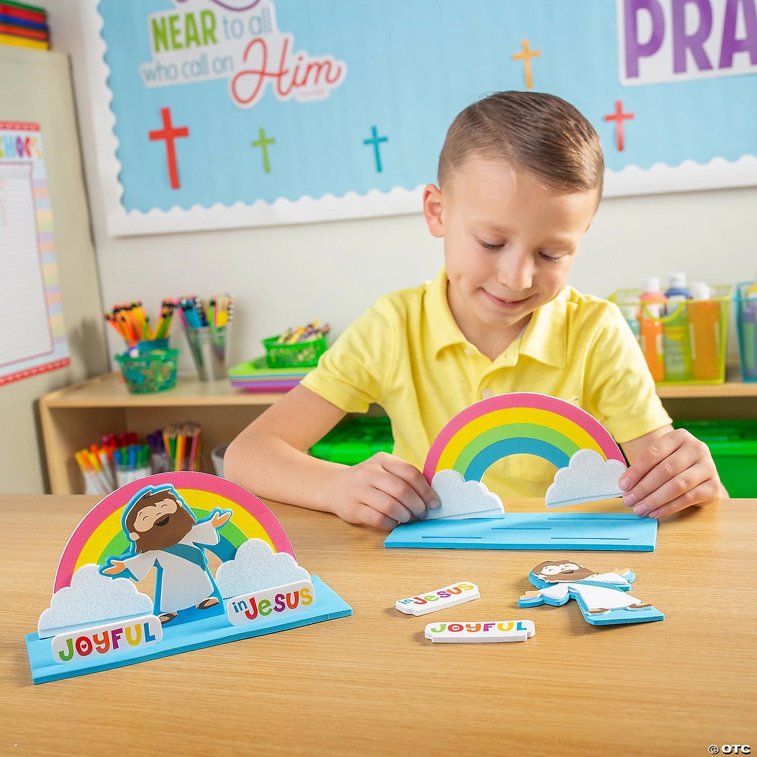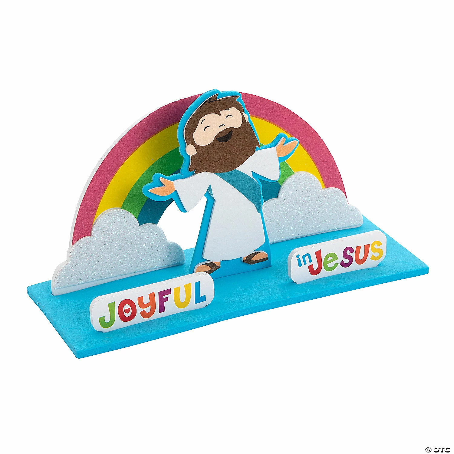 Remind Sunday School kids that they can be joyful in Jesus with this fun and simple craft kit. The completed craft is a 3D stand-up sign featuring a jubilant Jesus in front of a colorful rainbow along with the message βJoyful in Jesusβ. This simple peel-and-stick craft kit will be a hit with kids and teachers alike for its simplicity and ease of completion. Includes self-adhesive foam pieces. 8″ x 3″ x 4 1/4″ Makes 12. All craft kit pieces are pre-packaged for individual use. Kits include instructions. © OTCJoyful In Jesus 3D Stand-Up Instructions