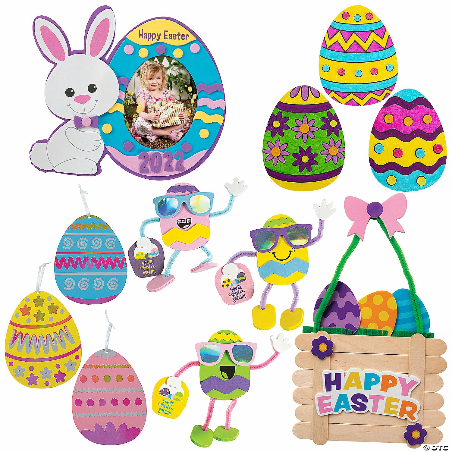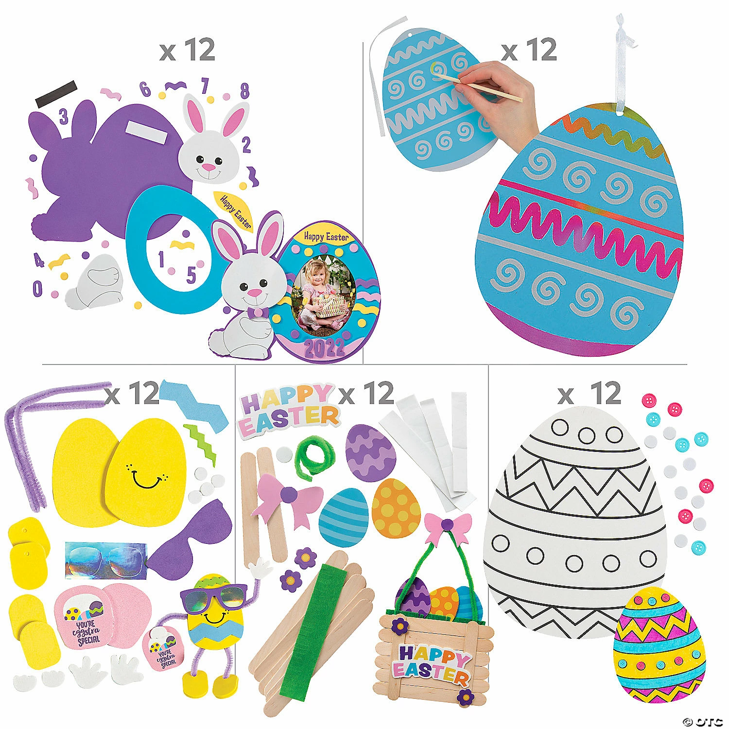 All of these wonderful eggs need decorating before the Easter bunny can make its deliveries! From cute photo frames and signs to coloring activities, this kit is packed with fun and is perfect for kids of all ages. These crafts are an egg-cellent addition to an Easter celebration or great as spring activities and unique decorations in the classroom! Makes 12. All craft kit pieces are pre-packaged for individual use. Kits include instructions. Assortment may vary.Includes:• 12 Craft Stick Easter Basket Craft Kits (Includes self-adhesive foam pieces, wooden craft sticks and chenille stems. 5 3/4″ x 8 3/4″)• 12 Color Your Own Easter Egg Button Craft Kits (Includes self-adhesive foam pieces, plastic buttons and cardstock. 7″ x 9″)• 12 Easter Egg Picture Frame Magnet Craft Kits (Includes self-adhesive foam shapes. 6 3/4″ x 5″ with a 3 3/4″ x 2 1/4″ photo space. Magnets are packaged separately. Do not discard.)• 12 Magic Color Scratch Jumbo Easter Eggs (Includes 12 eggs, 12 scratching tools and 12 satin ribbons. 8″)• 12 Stand-Up Easter Egg Character Craft Kits (Includes self-adhesive foam pieces, chenille stems and iridescent foil stickers. 6″ x 5 3/4″)